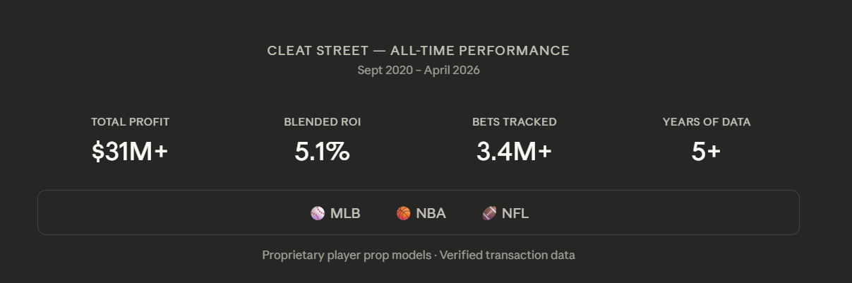 Cleat Street is a sports analytics company that identifies and prices player prop bets with a proven, systematic edge.